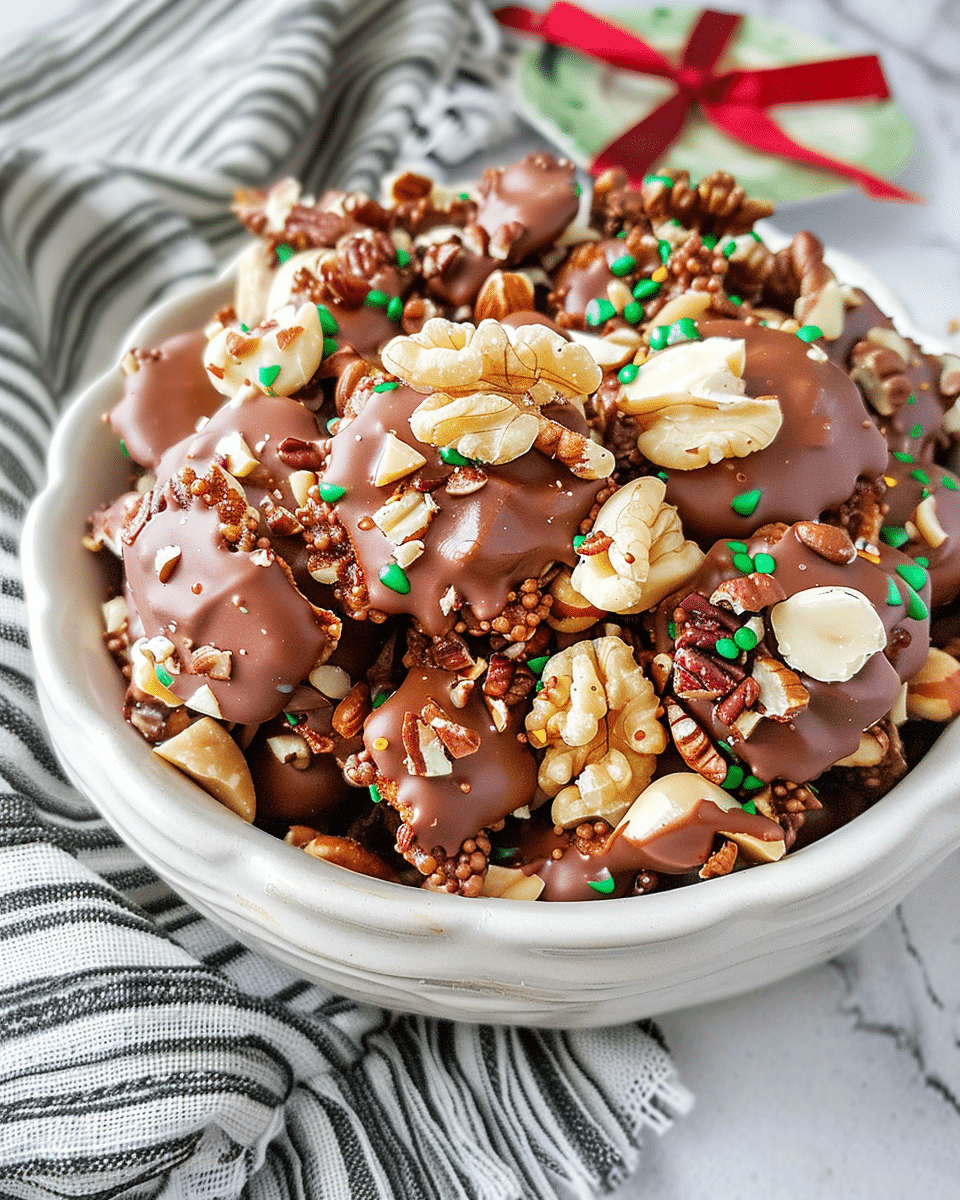 Use any combination of nuts—peanuts, almonds, pecans, or cashews.Add shredded coconut, dried fruit, or candy pieces for variety.Swap almond bark with peanut butter or butterscotch chips for a flavor twist.Sprinkle sea salt for a sweet-and-salty finish.Perfect for edible holiday gifts—pack in festive tins or bags.