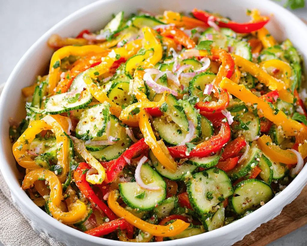 This Cucumber Sweet Pepper Salad is a crisp, refreshing dish made with crunchy cucumbers, colorful sweet peppers, and a light homemade vinaigrette. Perfect for summer meals, picnics, or quick healthy sides, this easy cucumber pepper salad is full of fresh flavor and vibrant texture. With minimal ingredients and quick preparation, it’s a bright and nutritious salad that pairs well with almost any meal.