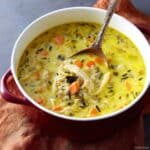 Store leftovers in an airtight container in the refrigerator for up to 4 days. Reheat on the stove over medium heat or in the microwave until warmed through. Stir occasionally to maintain consistency. This soup can be frozen for up to 2 months. Thaw in the refrigerator overnight and reheat gently. The rice may absorb some liquid, so add a splash of broth or water when reheating.