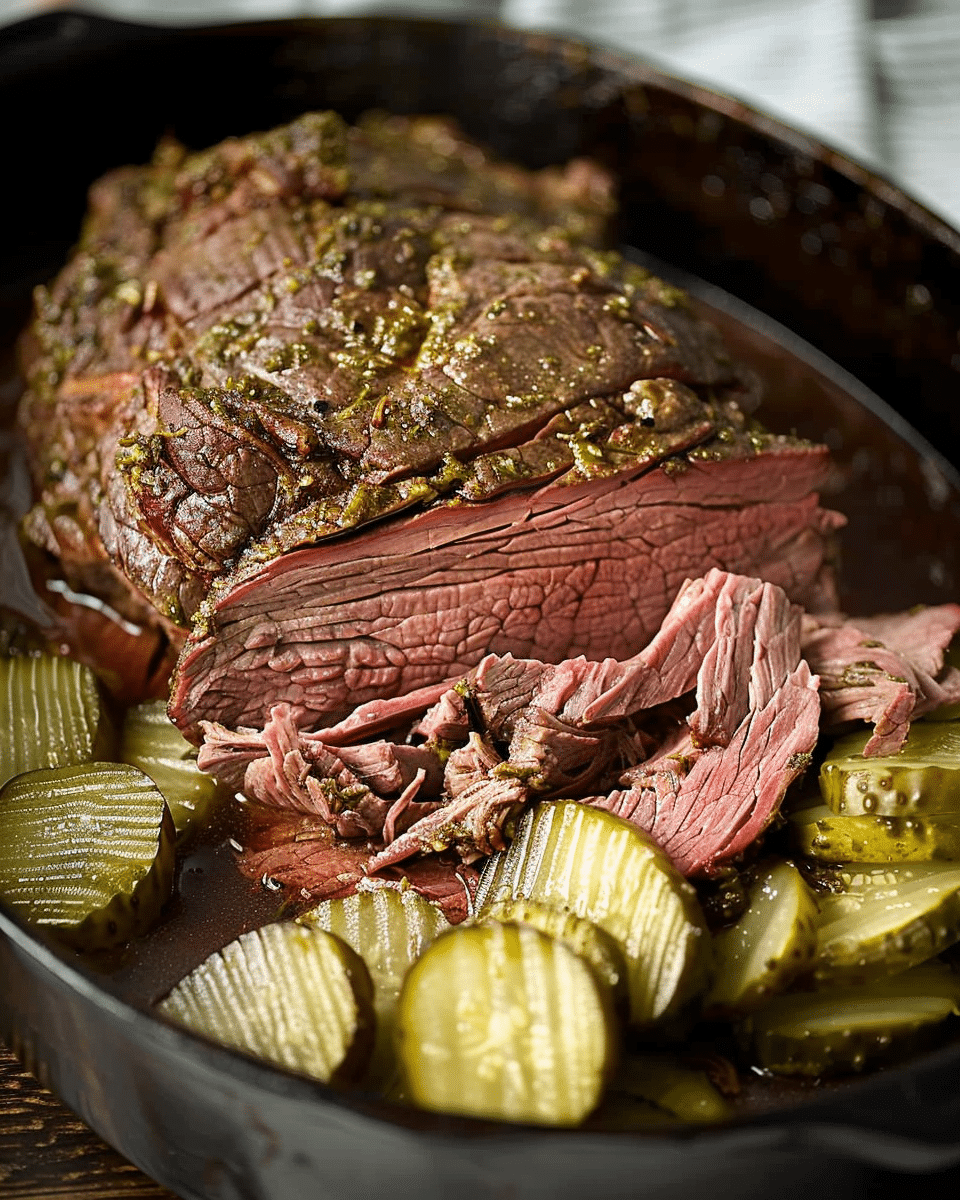 A tender, flavorful roast beef slow-cooked with dill pickles and pickle juice for a tangy, savory twist on classic comfort food. Easy to prepare and perfect for dinner, meal prep, or sandwiches.