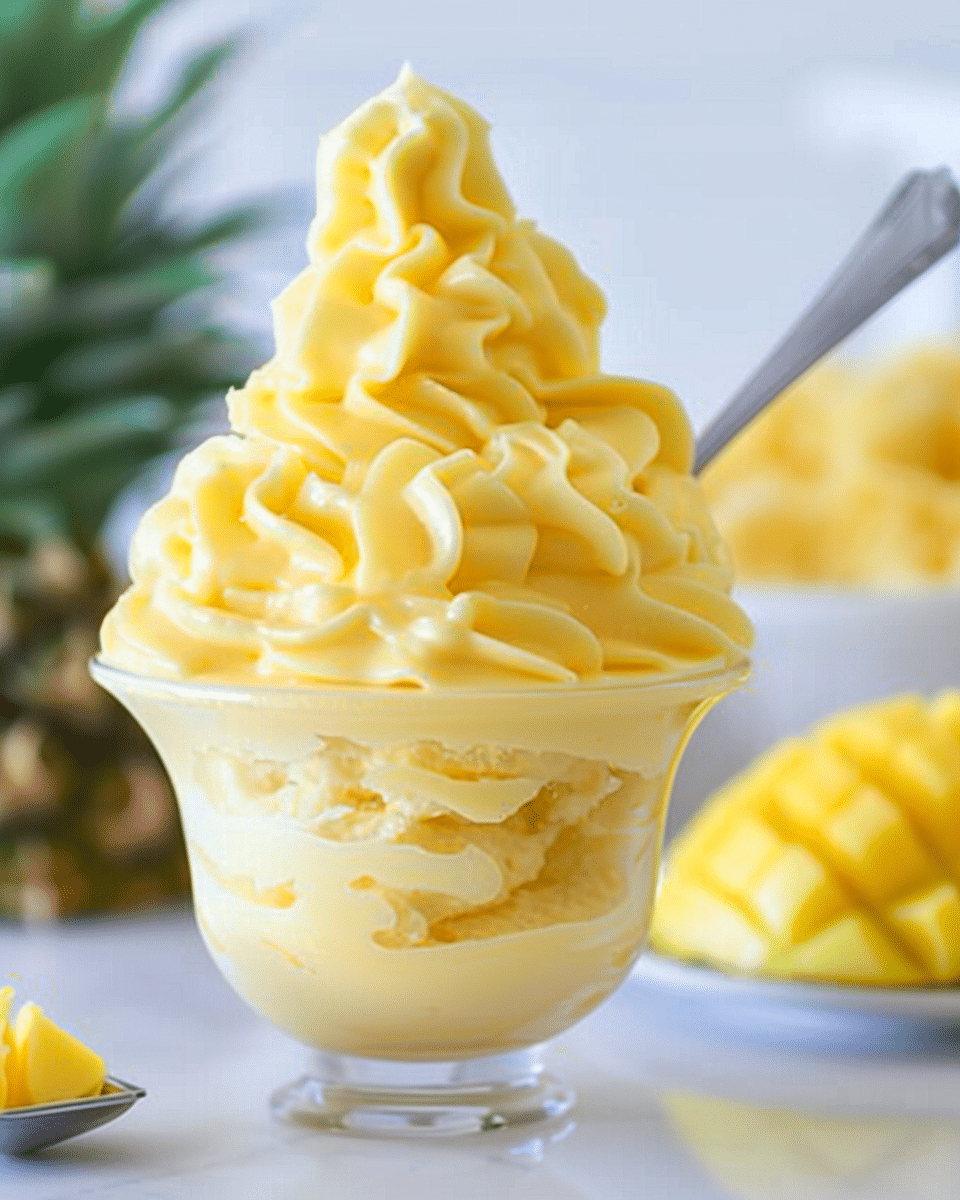 Dole Whip is a creamy, pineapple-flavored frozen dessert made with frozen pineapple, pineapple juice, and either ice cream or coconut milk for a dairy-free option. This quick blender recipe delivers the iconic tropical treat at home in just minutes.