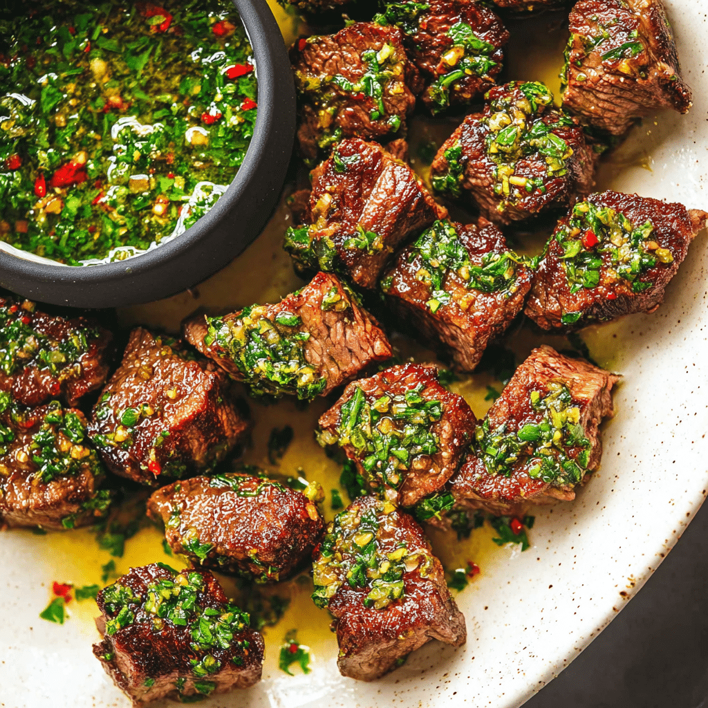 Juicy, bite-sized steak pieces quickly seared and tossed in a vibrant chimichurri sauce made with fresh herbs, garlic, and tangy vinegar for bold, fresh flavor.