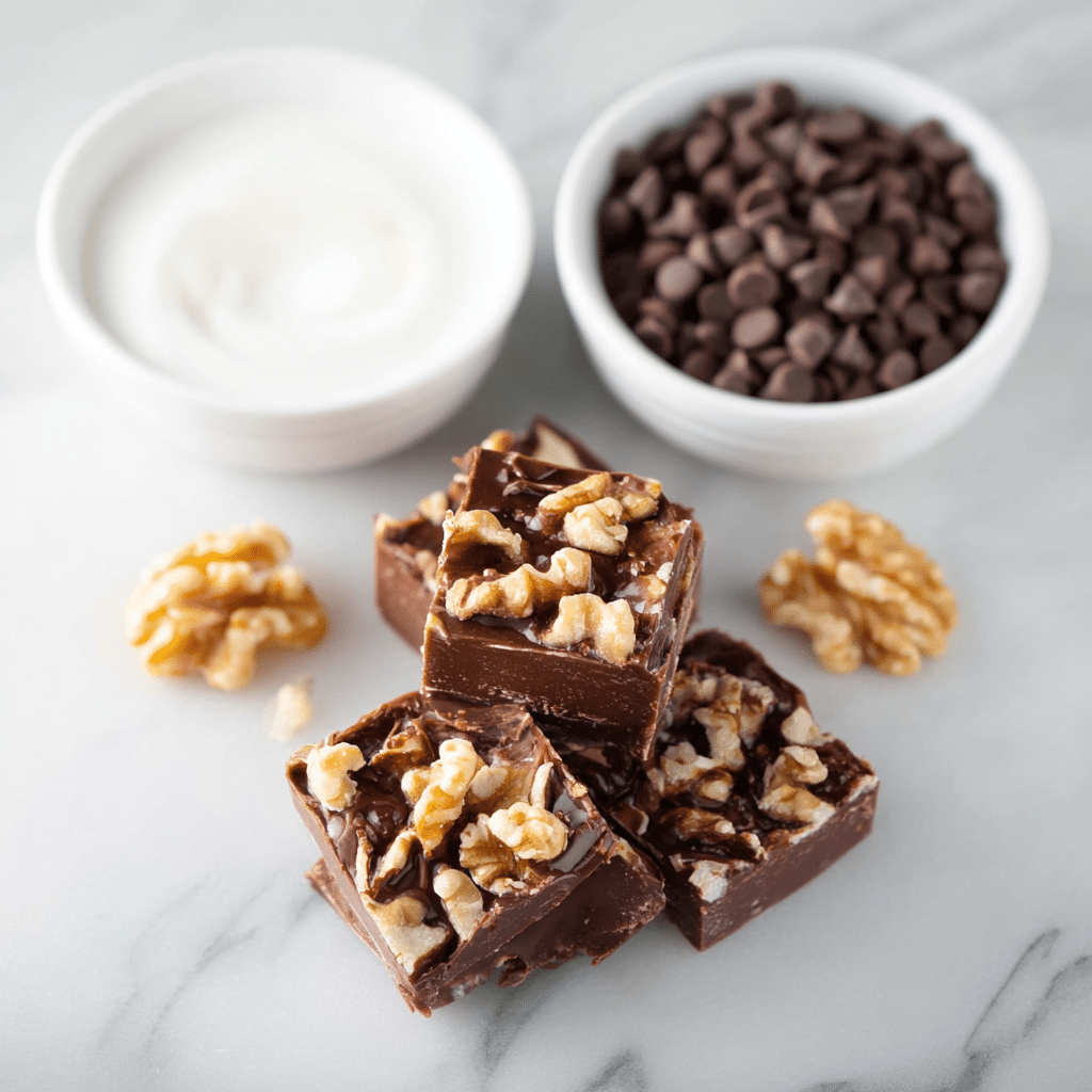 Walnuts can be substituted with pecans, almonds, or hazelnuts.Add a swirl of peanut butter or sprinkle of sea salt before chilling for extra flavor.Dark chocolate chips can be used for a richer, less sweet fudge.Toasting the walnuts enhances their flavor but is optional.Store in an airtight container in the refrigerator for up to 2 weeks or freeze for up to 2 months.