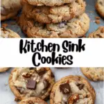 Kitchen Sink Cookies are chewy, sweet-and-salty cookies packed with a variety of mix-ins like chocolate chips, pretzels, toffee bits, and nuts. With crisp edges and soft centers, they’re a fun and customizable way to use up your pantry extras.