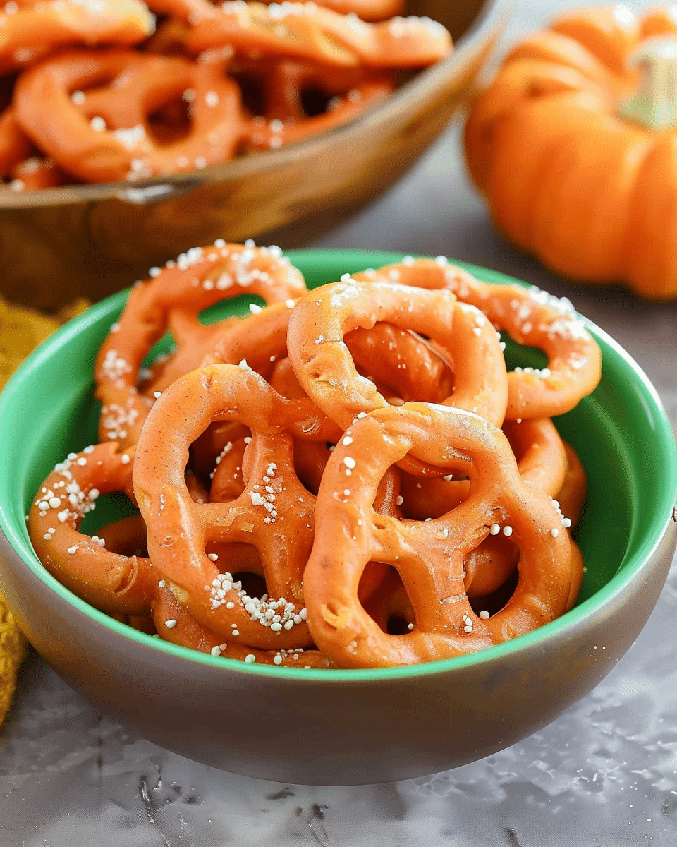 Store pumpkin pretzels in an airtight container at room temperature for up to one week. Keep them away from heat or moisture to prevent melting or softening. These treats do not require reheating and are best enjoyed at room temperature.