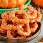 Easy pumpkin pretzels are a festive, no-bake fall treat made with mini pretzels dipped in orange candy coating and topped with green M&M’s to resemble little pumpkins. Perfect for parties, Halloween, or cozy autumn snacking.