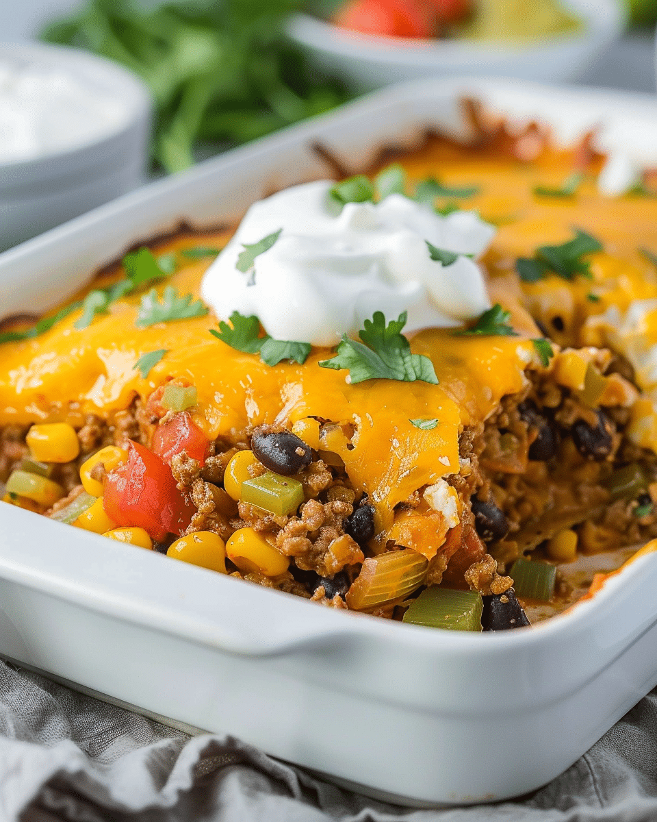 Vegetarian option: Replace ground beef with black beans, lentils, or meatless crumbles.For extra spice, add diced jalapeños or use hot salsa.Top with sour cream or guacamole for added creaminess.If you prefer a cheesy casserole, top with more cheese and broil for a few minutes to brown the cheese.