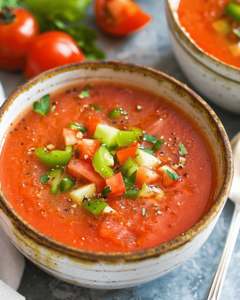 Easy Tomato Gazpacho Soup is a refreshing, chilled Spanish soup made with fresh tomatoes, cucumbers, bell peppers, and a tangy dressing of olive oil, garlic, and vinegar. This no-cook soup is perfect for hot summer days and offers a light, healthy meal packed with vibrant flavors.