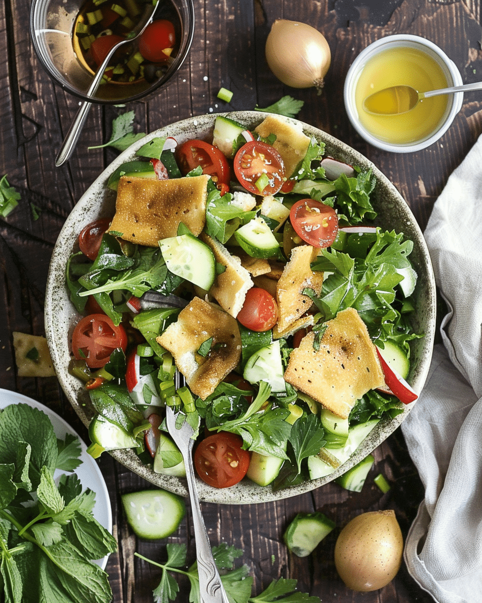 Fattoush is a fresh, flavorful salad that’s both simple and satisfying. With its mix of crunchy pita, crisp veggies, and tangy dressing, it brings a bold taste of the Middle East to your table. Whether you serve it on its own or alongside your favorite main dish, this salad is sure to impress with its bright flavors and vibrant textures.