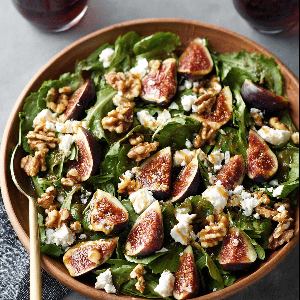 This salad highlights the natural sweetness of fresh figs while balancing it with the tangy richness of goat cheese. The walnuts add a satisfying crunch that contrasts beautifully with the soft texture of the figs.