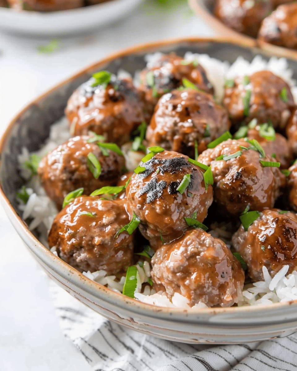 Serve: Garnish the meatballs with sesame seeds and chopped green onions for a little extra flavor and color. Serve them hot as an appetizer, over rice, or with vegetables for a complete meal.