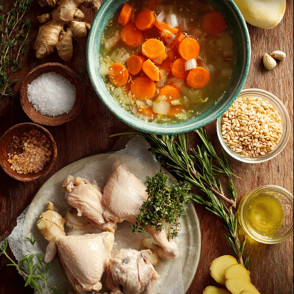 chicken (bone-in or boneless) carrots celery onion garlic chicken broth water olive oil salt black pepper bay leaf fresh parsley egg noodles or rice (optional) lemon juice (optional)