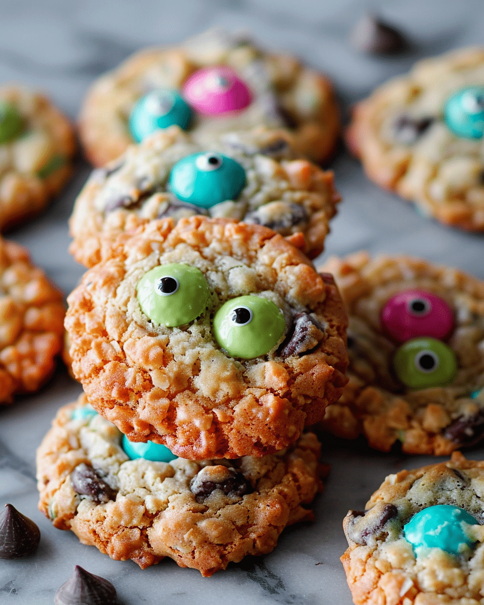 Gooey Monster Cookies are soft, chewy, and colorful cookies filled with M&Ms, chocolate chips, and candy eyeballs — a spooky-sweet treat perfect for Halloween or any fun occasion.