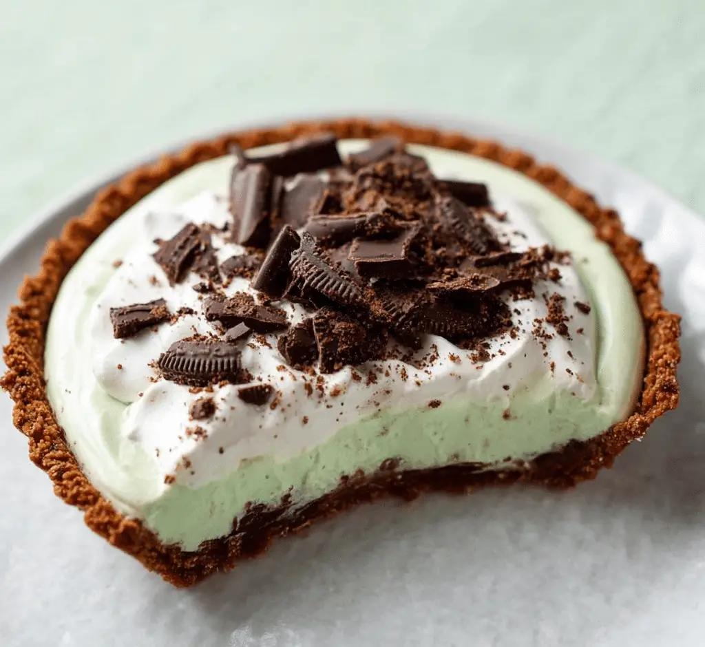 Grasshopper Pie is a refreshing, no-bake dessert with a cool minty cream filling in a chocolate cookie crust, topped with chocolate for a light yet indulgent treat.