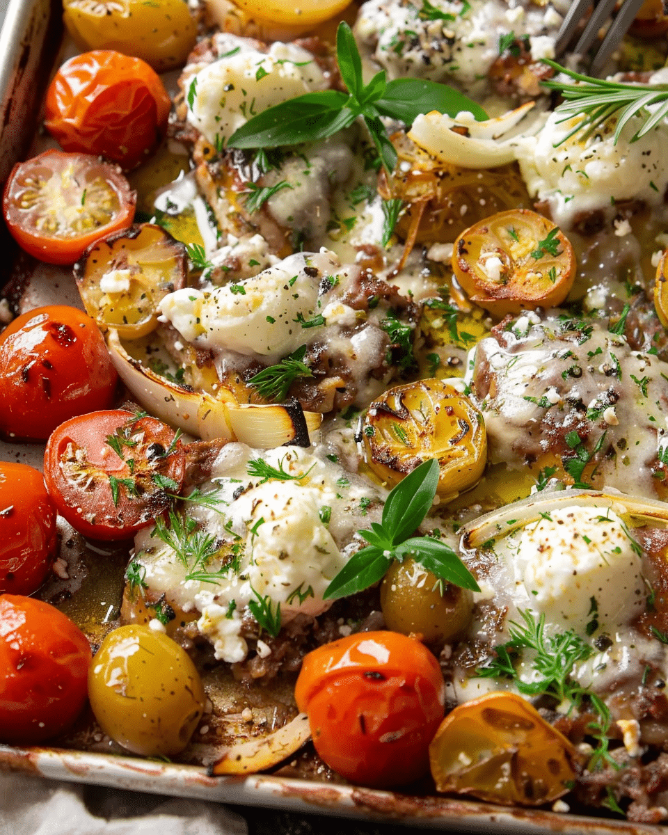 A vibrant one-pan Mediterranean-style meal featuring marinated chicken, roasted vegetables, olives, and feta for a flavorful and easy weeknight dinner.