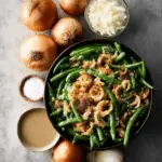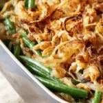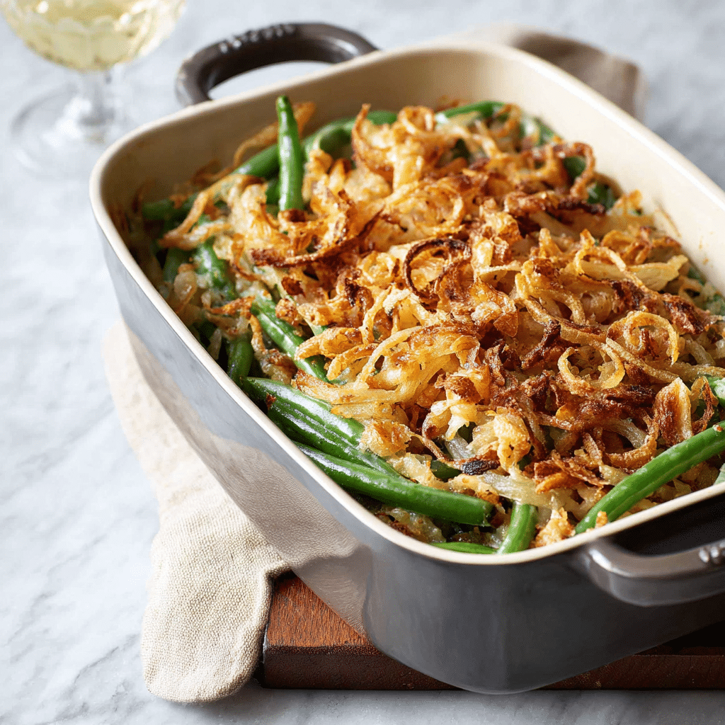 A creamy, savory green bean casserole with tender green beans, rich mushroom sauce, and a crispy onion topping. A classic side dish for holidays, potlucks, or cozy dinners.