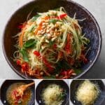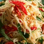 Green Papaya Salad (Som Tum) is a spicy, tangy, and refreshing Thai salad made with shredded green papaya, tomatoes, green beans, peanuts, and a bold lime-fish sauce dressing. It’s a vibrant, crunchy dish that’s light yet bursting with flavor.