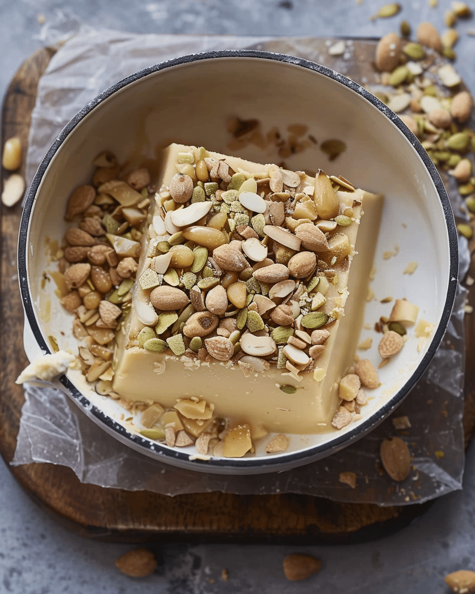 Nutty Halva: Fold in chopped pistachios, walnuts, or almonds for crunch and added flavor.