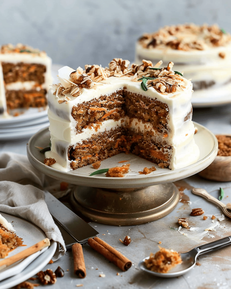Store leftover carrot cake in an airtight container at room temperature for up to 2 days or in the refrigerator for up to 5 days. For longer storage, wrap slices individually and freeze for up to 3 months. To reheat, thaw overnight in the refrigerator and warm in the microwave for 15–20 seconds before serving.