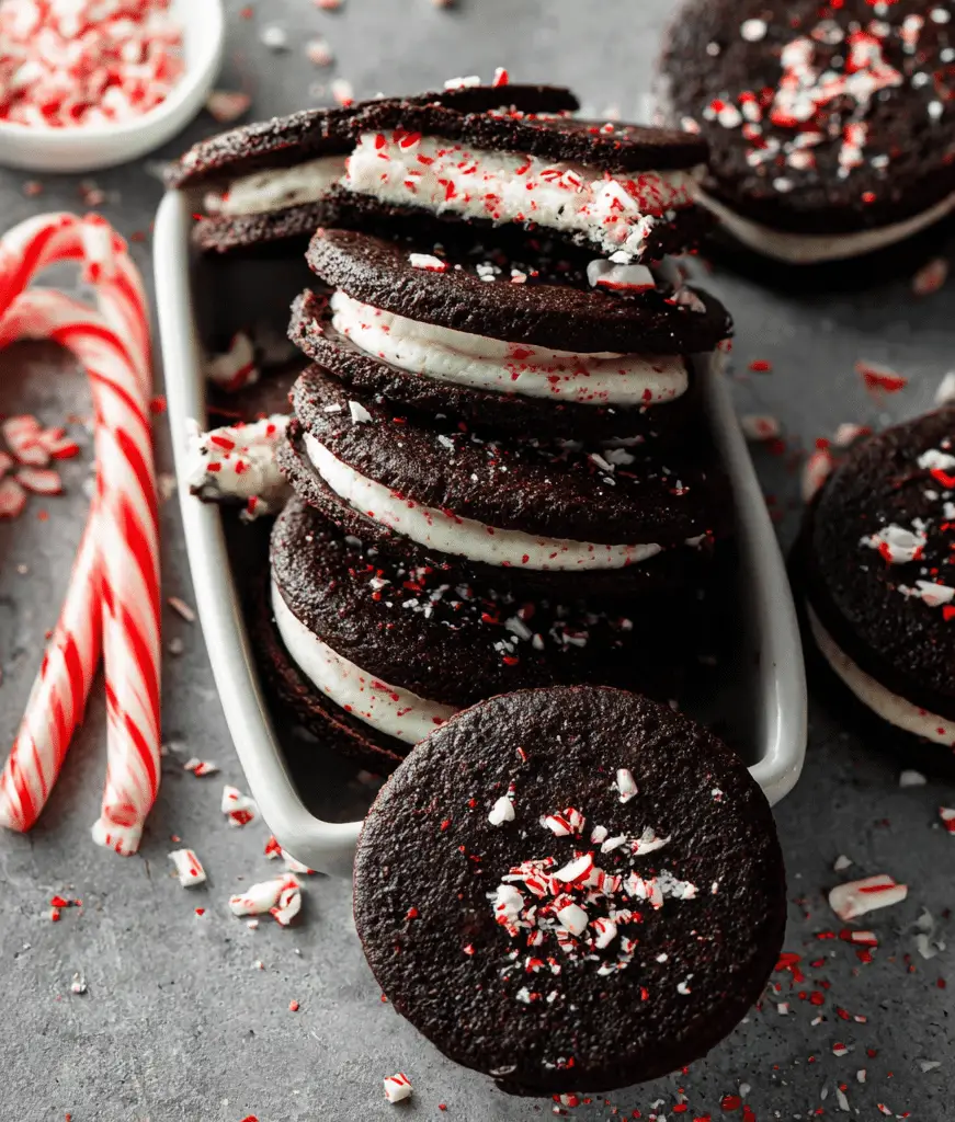 Chill the dough for 20–30 minutes if it feels too soft before baking.Use Dutch-process cocoa powder for a deeper chocolate flavor.Add a drop of green food coloring to the filling for a festive look.For decoration, dip half of each sandwich cookie in melted chocolate.Roll the edges of the filled cookies in extra crushed peppermint candies for a bakery-style finish.