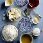 (Tip: You’ll find the full list of ingredients and measurements in the recipe card below.) all-purpose flour baking powder salt unsalted butter granulated sugar eggs milk vanilla extract red white and blue sprinkles powdered sugar (for frosting) heavy cream or milk (for frosting) additional butter (for frosting)
