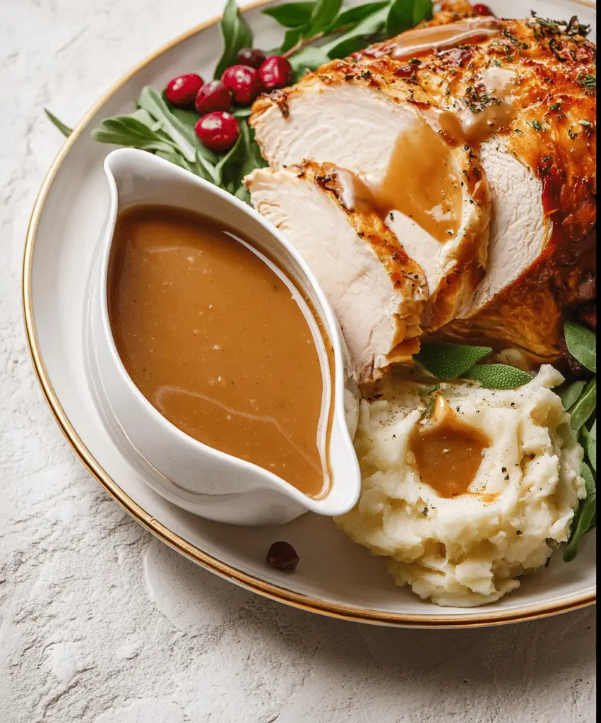 Homemade Turkey Gravy is a rich, smooth sauce made from turkey drippings, broth, and seasonings, perfect for pouring over roasted turkey, mashed potatoes, or stuffing.