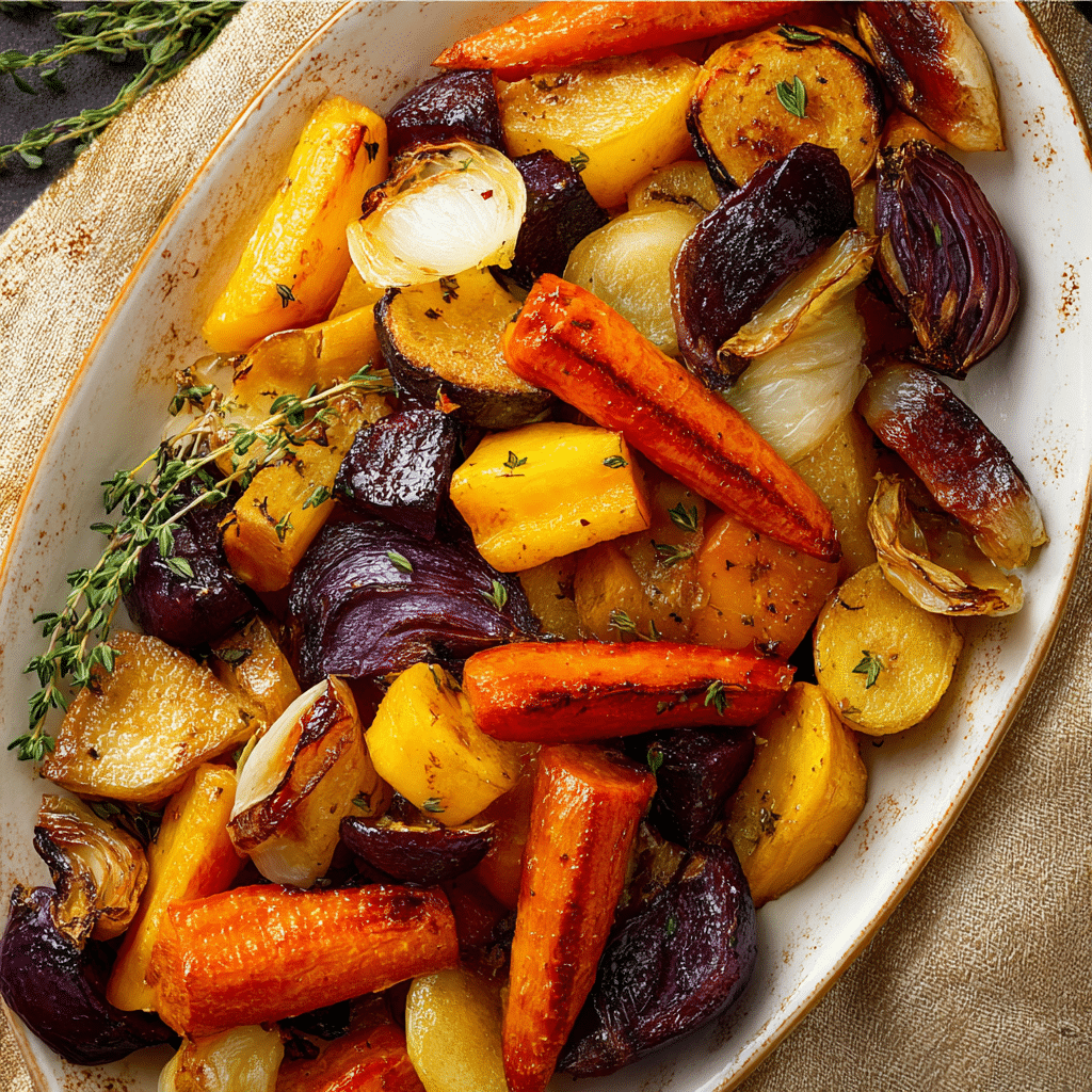 Honey Thyme Roasted Root Vegetables are a colorful, caramelized side dish with a hint of honey and fragrant thyme, featuring a mix of carrots, parsnips, sweet potatoes, and turnips.