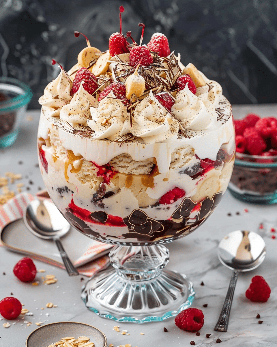 An ice cream sundae trifle is a layered dessert that combines ice cream, cake or cookies, sauces, whipped cream, and toppings into a stunning, party-ready dish. It’s customizable, indulgent, and sure to impress guests.