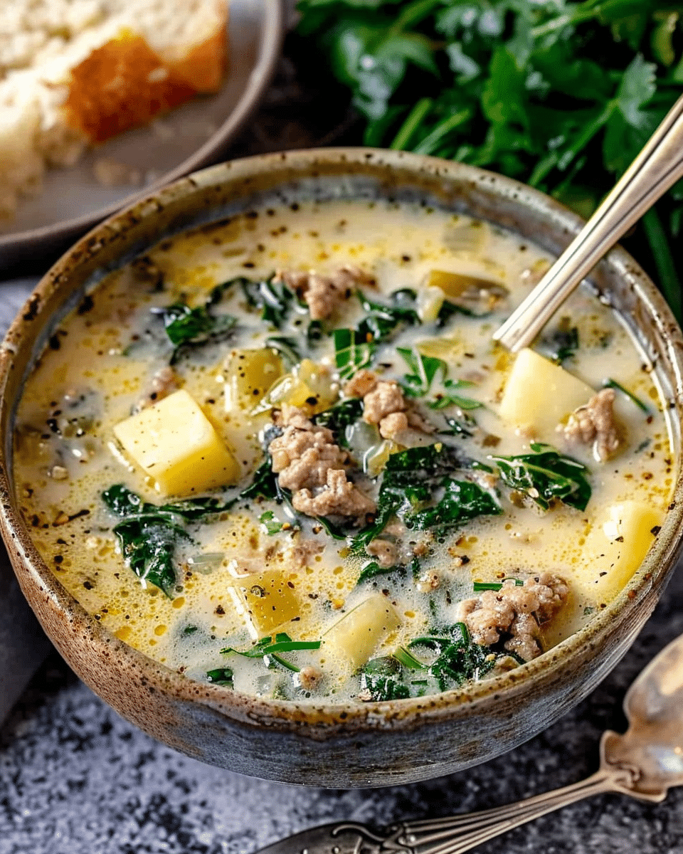 Zuppa Toscana means “Tuscan soup” in Italian. It typically features sausage, potatoes, kale, and a creamy broth.