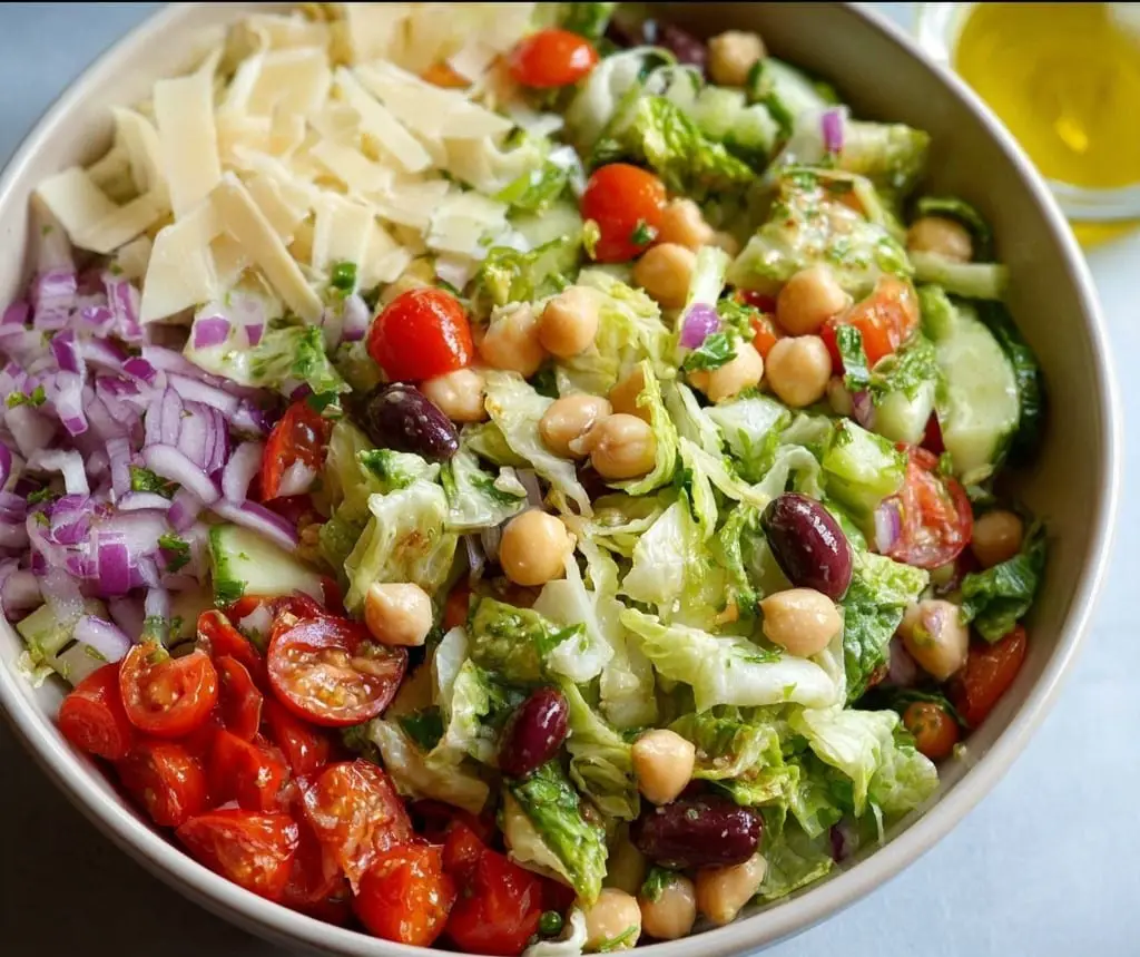 For a vegetarian version, omit the meat and add extra chickpeas or roasted vegetables.Store ingredients separately if making ahead, and dress just before serving to maintain crunch.Use homemade Italian dressing for extra flavor—combine olive oil, red wine vinegar, Dijon mustard, garlic, oregano, salt, and pepper.Pair with pizza, pasta, or grilled chicken for a full Italian-style meal.