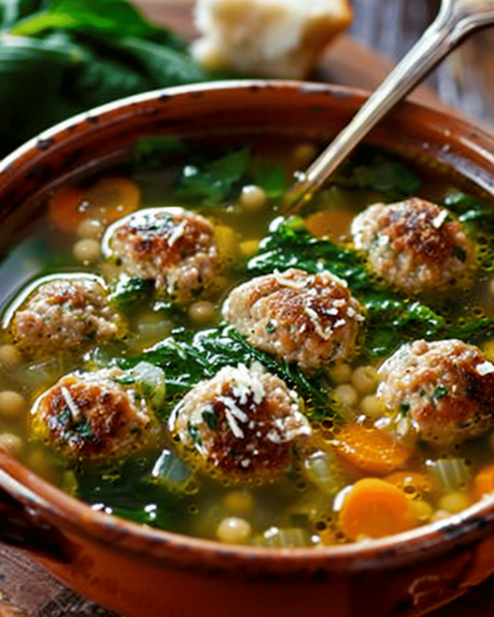 Italian Wedding Soup with Parmesan Meatballs is a comforting, flavorful soup made with tender meatballs, fresh greens, and tiny pasta in a savory broth. Despite its name, the ‘wedding’ refers to the perfect harmony between the meat and vegetables.