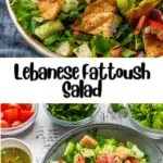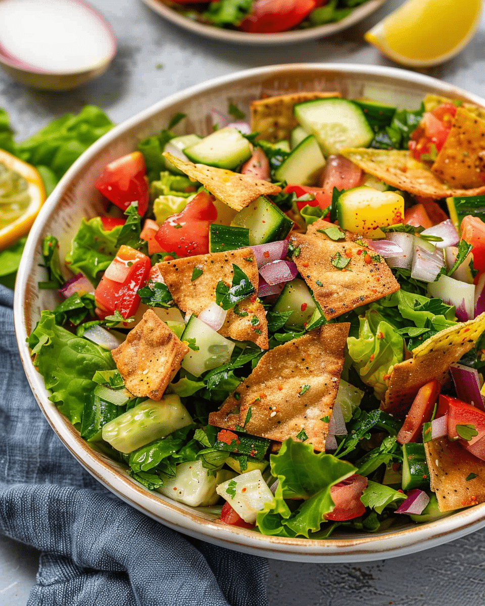 Fattoush is a Lebanese salad made with mixed vegetables, herbs, and crispy pita bread, all tossed in a tangy lemon-sumac dressing.