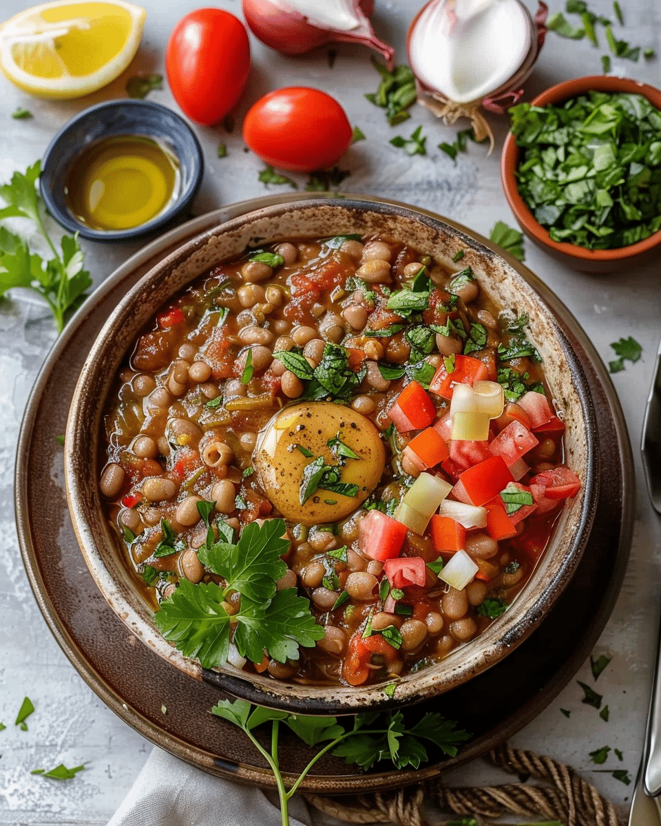 Lebanese Ful Medames is a hearty and flavorful Middle Eastern dish made with mashed fava beans, lemon juice, garlic, and olive oil. It’s a wholesome, plant-based meal often enjoyed for breakfast, served with fresh herbs, vegetables, and pita bread.