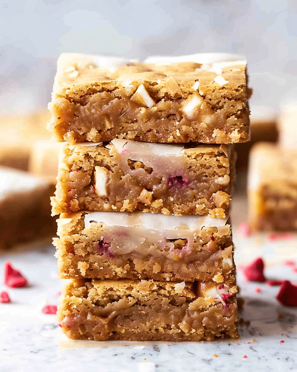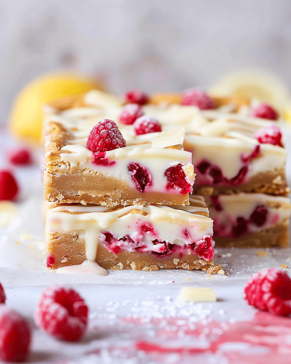 Use high-quality white chocolate for best texture and flavor.Gently fold raspberries to avoid over-bleeding into batter.Chilling the bars before slicing yields cleaner cuts.Optional: add toasted nuts for crunch or swap in blueberries for a twist.Don’t overbake — blondies are best slightly fudgy in the center.