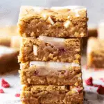 Storage: Once fully cooled and glazed, store the blondies in an airtight container at room temperature for up to 2‑3 days. If your room is warm or humid, you may prefer to store them in the refrigerator, where they’ll keep for up to 4‑5 days though the texture may firm up. Freezing: You can freeze the un‑cut bars (wrapped in plastic wrap then foil) for up to 2‑3 months. Thaw in the refrigerator or at room temperature before slicing. If already glazed, freeze single‑layer and separate with parchment to prevent sticking. Reheating: These are best served at room temperature; if you prefer slightly warmed, lightly warm a bar in a low oven (~150 °C / 300 °F) for 5 minutes, but avoid microwave‑heating which may soften the glaze too much and make the texture mushy.