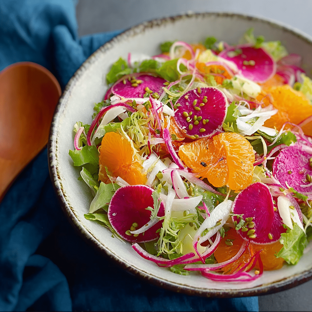 This Mandarin And Rainbow Radish Salad is a fresh, vibrant, and healthy dish that combines sweet citrus with crisp, peppery radishes. Light and colorful, this easy salad recipe is perfect for spring and summer meals, offering a refreshing balance of flavors and textures.