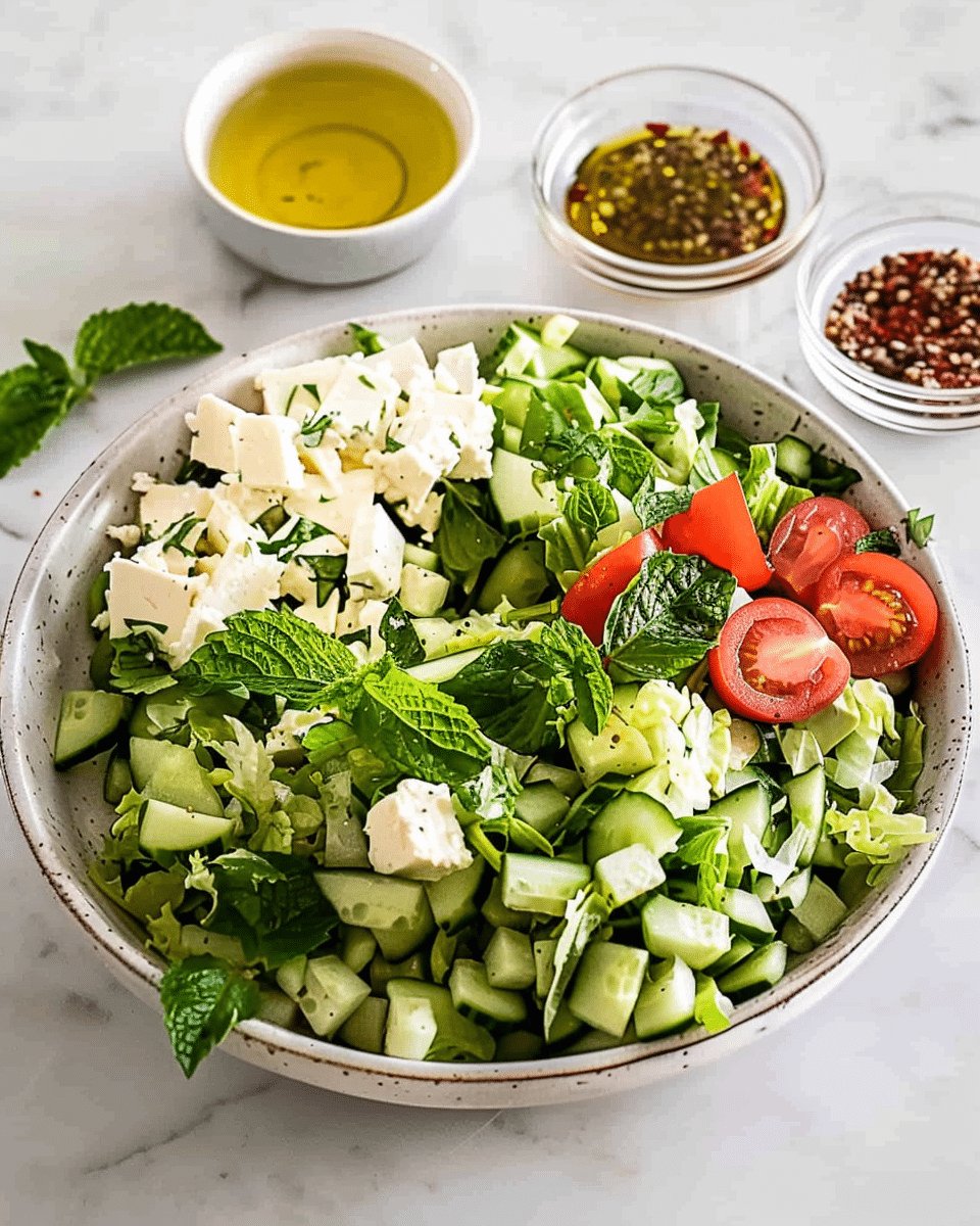 Use lemon juice instead of vinegar for a citrusy twist.Add crumbled feta cheese for a salty, creamy touch.Keep dressing and vegetables separate if preparing ahead.Pairs well with grilled meats, seafood, or Mediterranean mains.Use fresh, crisp lettuce for the best texture and flavor.