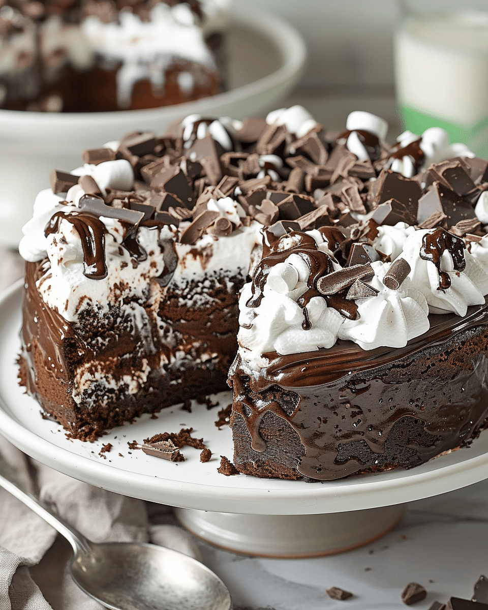 For best results, chill the cake before serving to allow the marshmallow and frosting to set.Omit sweetened condensed milk for a less rich cake.Top with chocolate chips, nuts, or sprinkles for added texture.Can be made a day ahead—flavors improve overnight.Use homemade chocolate cake instead of boxed mix if preferred.