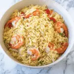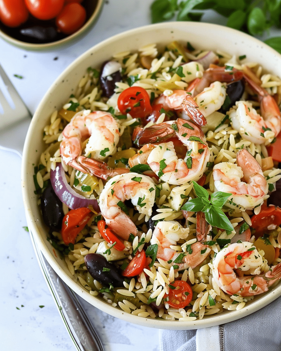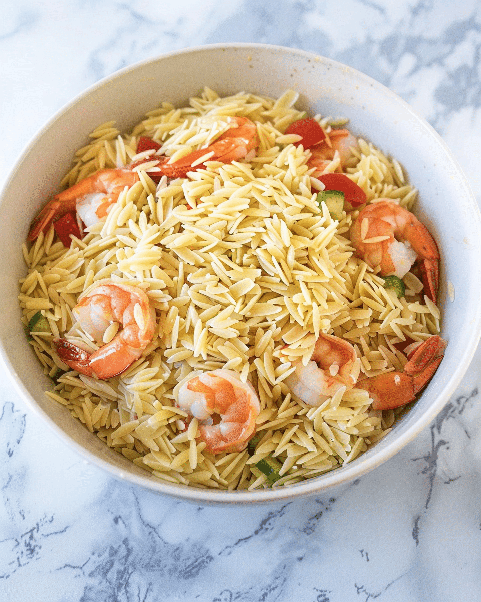 Chill before serving for best flavor.Use gluten-free orzo if needed.Grilled chicken or chickpeas can be used instead of shrimp.Refresh leftovers with olive oil and lemon juice.Best served cold or at room temperature; do not reheat.