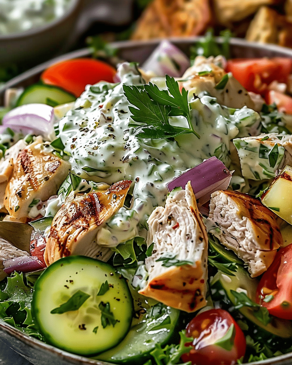A refreshing Mediterranean-inspired chicken salad made with tender chicken, crisp vegetables, olives, and feta, all tossed in a creamy homemade tzatziki dressing. Light, protein-packed, and perfect for lunch, dinner, or meal prep.