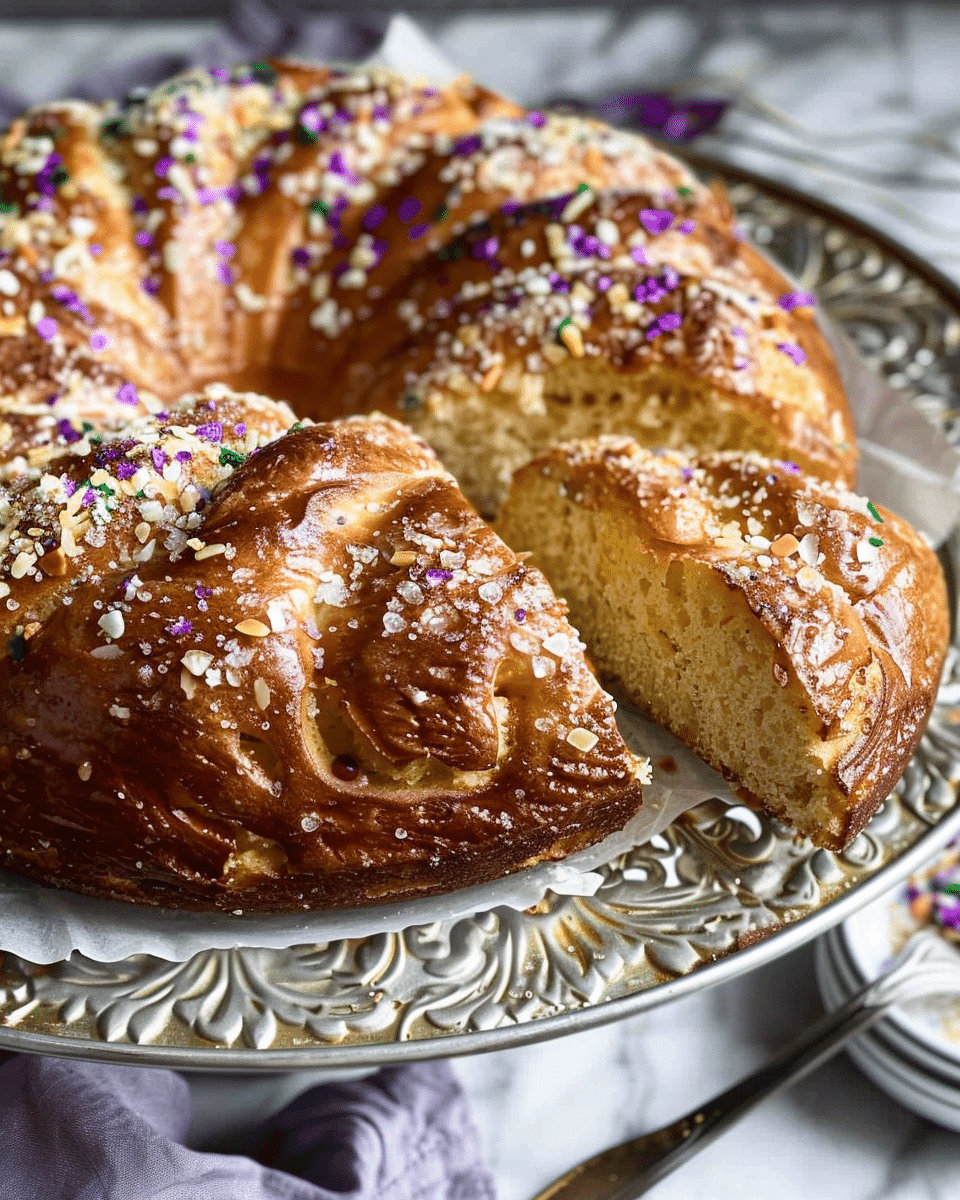 Glaze the cake: Once the cake has cooled slightly, drizzle the glaze evenly over the top. While the glaze is still wet, sprinkle with the colored sugar or sprinkles in the traditional Mardi Gras colors: purple, green, and gold.