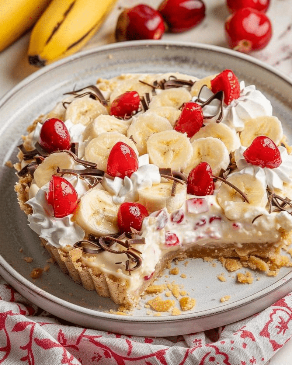 No-Bake Banana Split Pie combines the classic flavors of a banana split into a creamy, chilled pie. With layers of graham cracker crust, cream cheese filling, fresh bananas, crushed pineapple, whipped cream, and crunchy vanilla wafers, this refreshing and indulgent dessert is perfect for warm days and gatherings.
