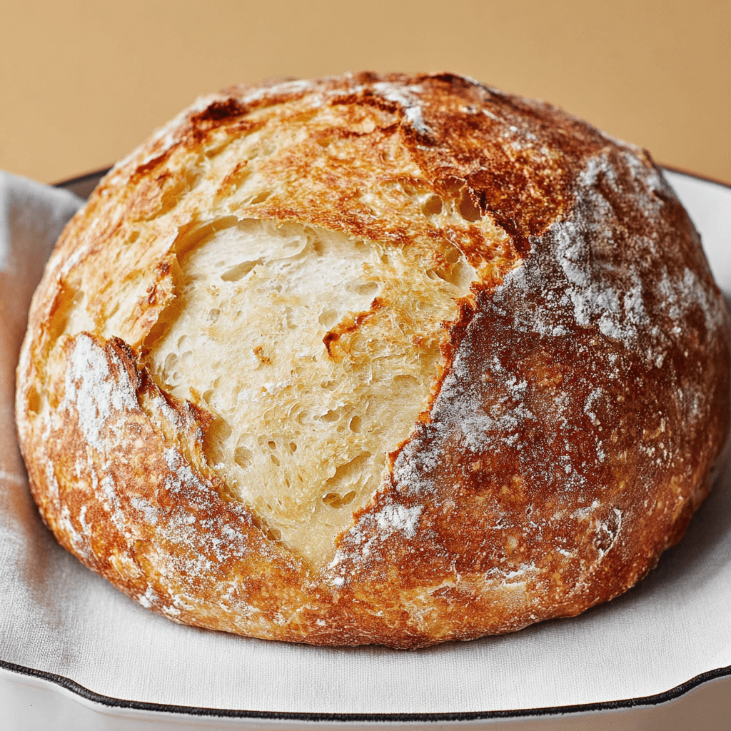 The long rise develops flavor and airy texture.Dough is intentionally sticky—lightly flour hands when shaping.Dutch oven creates steam for a crisp crust; alternatives: baking stone with a pan of hot water.Optional flavor additions: herbs, roasted garlic, cheese, olives, or seeds.Avoid slicing immediately to prevent a gummy interior.