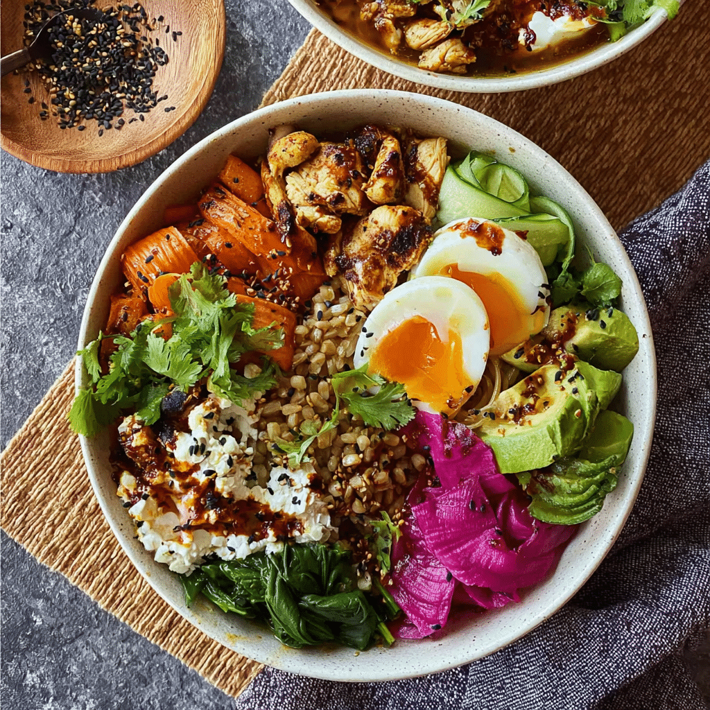 1–2 cups protein (chicken, tofu, chickpeas, or eggs)
