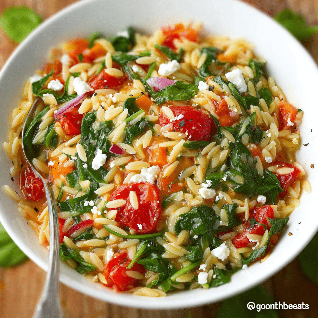 This Orzo Spinach Feta Salad with Tomato is a fresh, vibrant, and easy pasta salad packed with tender orzo, juicy tomatoes, crisp spinach, and tangy feta cheese. Perfect for meal prep, picnics, or light meals, this Mediterranean-inspired salad is quick, flavorful, and satisfying.