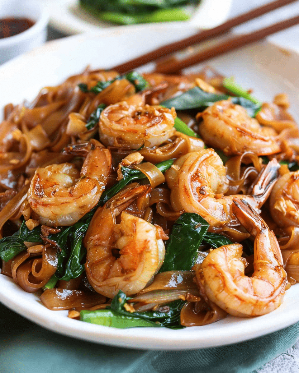 Pad See Ew Shrimp is a Thai stir-fried noodle dish made with wide rice noodles, tender shrimp, Chinese broccoli, and scrambled eggs tossed in a rich and savory-sweet soy-based sauce. It’s bold, satisfying, and quick to make in one pan.
