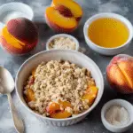 Use frozen peaches directly from the freezer; add a few extra minutes to baking time.For gluten-free, use GF flour and certified GF oats.Add chopped nuts to the topping for crunch.Serve with vanilla ice cream or whipped cream for a classic finish.Store leftovers covered in the fridge for up to 4 days.
