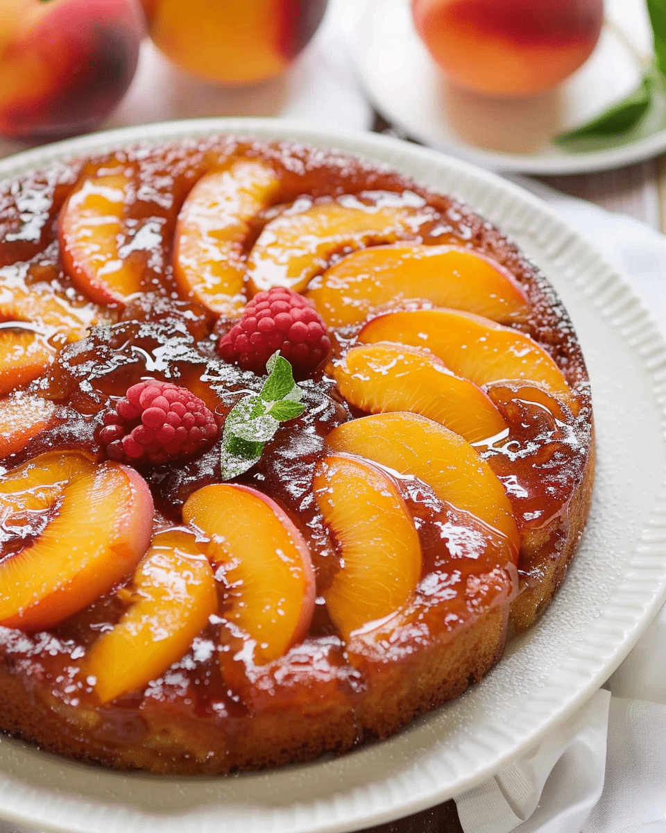 This cake combines the warm, nostalgic charm of upside down cakes with the bright, juicy flavor of peaches. It’s easy to make with fresh, canned, or frozen peaches, and it looks impressive without requiring any decorating skills. Each bite is a perfect balance of tender cake and syrupy peach topping—comforting, fruity, and full of flavor.