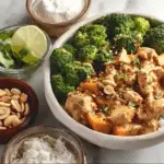 Peanut Chicken Sweet Potato and Broccoli Bowls are a nutritious and flavorful meal featuring tender chicken, roasted sweet potatoes, and crisp broccoli served over rice or quinoa and drizzled with a creamy peanut sauce. This peanut chicken bowl recipe is perfect for healthy meal prep, easy weeknight dinners, and balanced lunches packed with protein and vegetables.