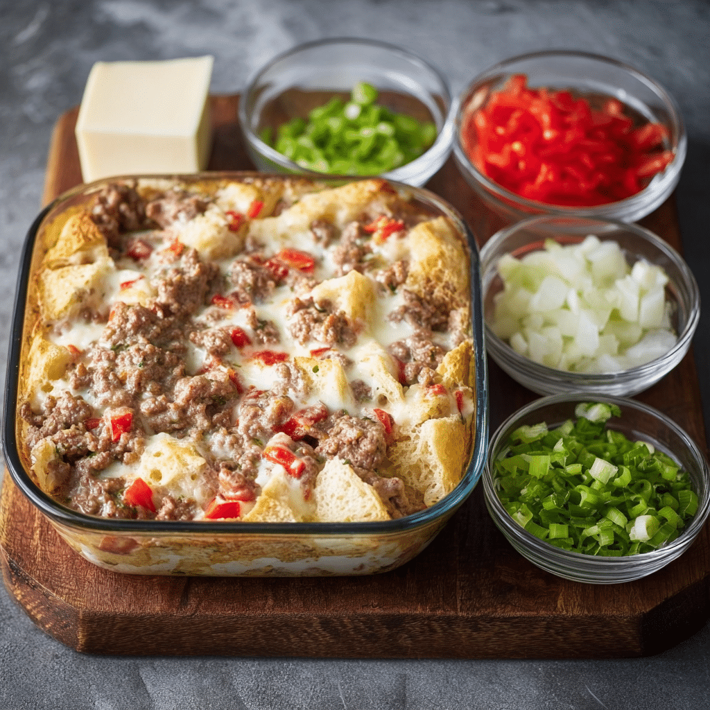 Philly Cheesesteak Casserole is a rich and comforting baked dish inspired by the classic sandwich. Made with tender beef, sautéed peppers and onions, creamy sauce, and melted provolone and mozzarella cheese, this easy casserole delivers bold cheesesteak flavor in a simple, family-friendly meal perfect for weeknight dinners or meal prep.